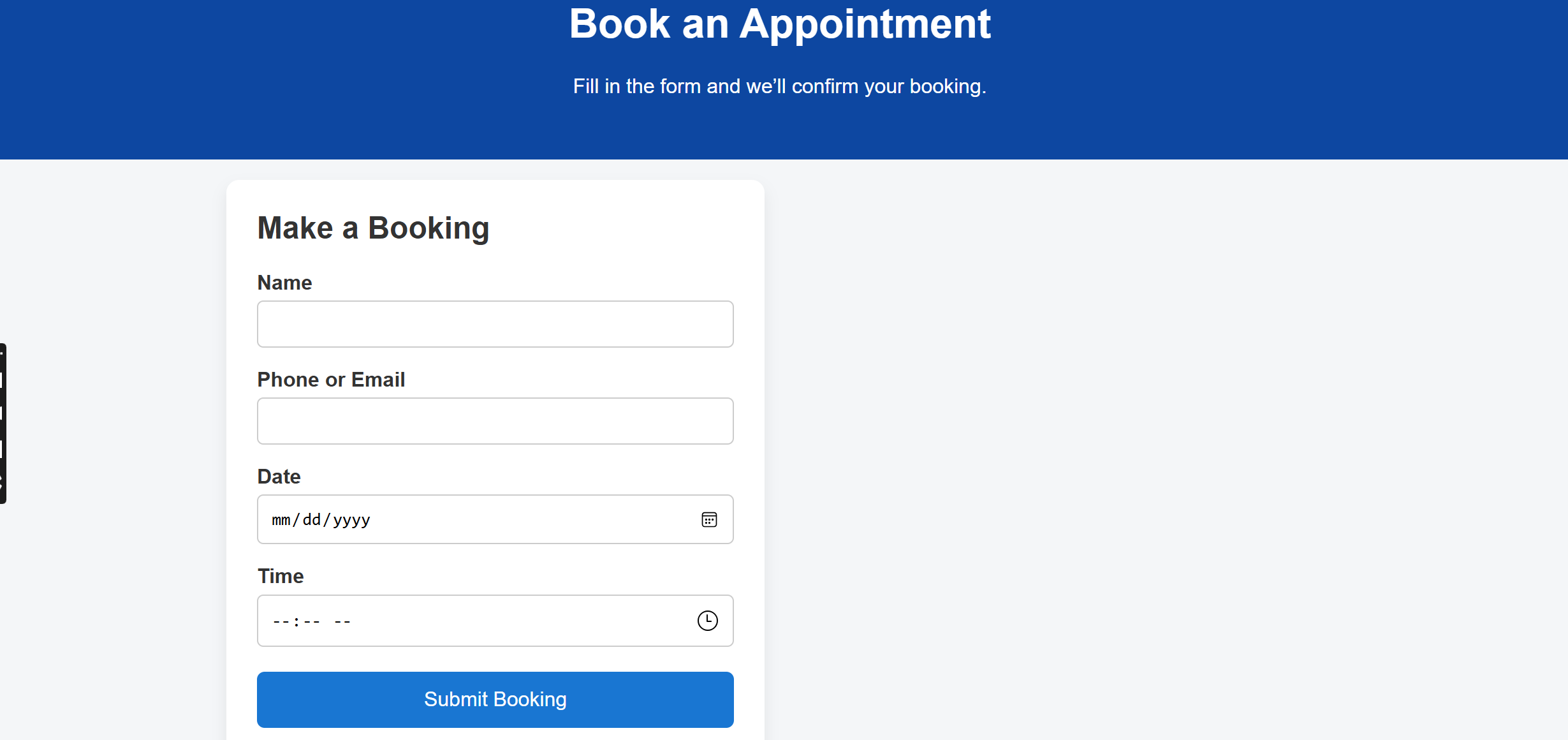 A simple appointment booking system built with HTML, CSS, and JavaScript. Users can submit booking requests, while admins can approve, reject, or delete bookings through a protected admin panel. Booking data is stored using browser localStorage to simulate real-world booking management.